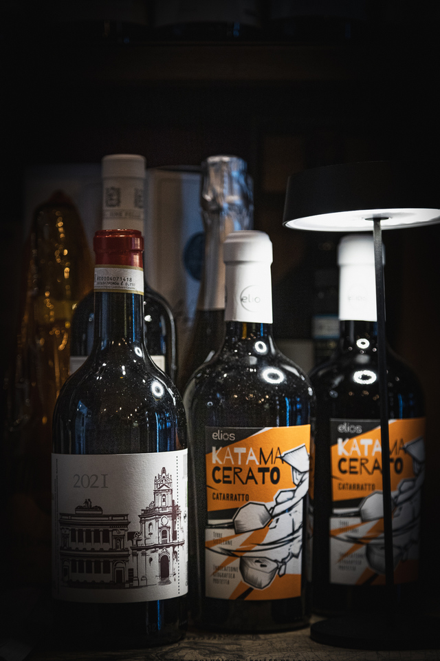 Tra la selezione delle cantine siciliane: CANTINA MARILINA, CANTINA MARABINO, TENUTA LA FAVOLA, ZISOLA, ARIANNA OCCHIPINTI, COS, GULFI, BARONE PUPILLO, FELICE MODICA, VINI CAMPISI e CANTINE GULINO che fanno parte del comprensorio della Val di Noto. Inoltre MARCO DE BARTOLI, BARONE DI MONTALTO, CUSORA, TERRE DI GIUMARA, e per la costa Ovest VIVERA e FILIPPO GRASSO e PLANETA per i vini Etnei. Dal messinese Messina PALARI, CARAVAGLIO ed HAUNER. Zona interna: TENUTA REGALEALI (CONTEA DI SCLAFANI). Per quanto riguarda i vini nazionali, la rappresentativa Toscana con COLLE BERETO, RUFFINO e FRESCOBALDI. Dal Trentino Alto Adige, KALTERN TENUTE DI CALDARO, dalla Lombardia il FRANCIACORTA. Da oltre confine, le bolliccine con CHAMPAGNE, bianco di Borgogna, Alsazia ed un Riesling Californiano.